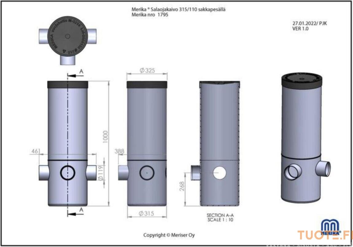Salaojan tarkastuskaivo kaikkiin rakennuskohteisiin. Yksi liitännöistä valmiiksi auki, loput liitännät avattavia. Salaojakaivo katkaistaan paikalla sopivaan pituuteen. Suojahattu sisältyy toimitukseen.