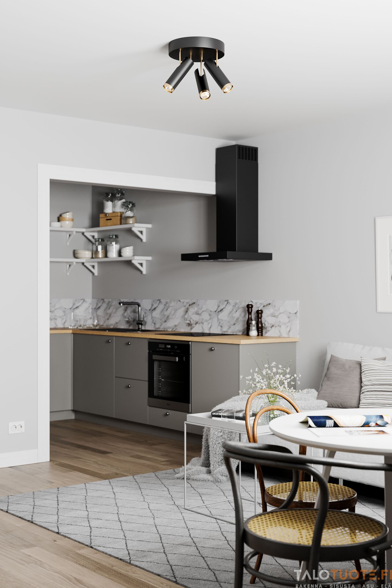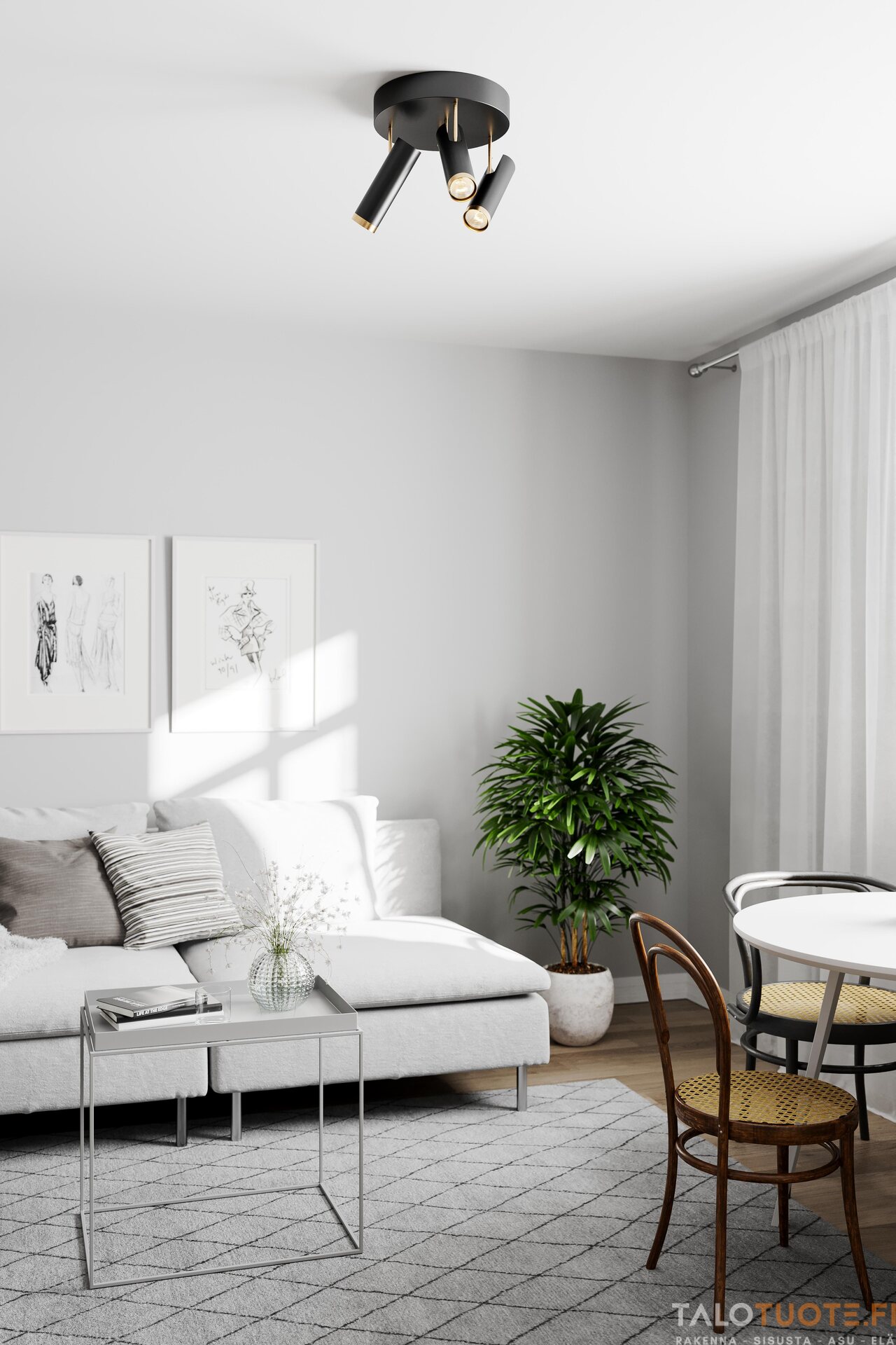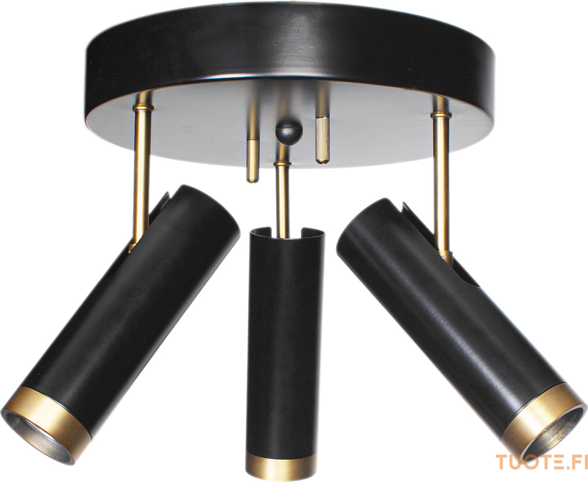 Metallinen moderni kattovalaisin kolmella suunnattavalla mustan ja kullanvärisellä spotilla , joka on helposti sijoitettavissa eteiseen, keittiöön tai olohuoneeseen. Valon voi levittää koko huoneeseen tai suunnata korostamaan tauluja tai tuomaan valo esimerkiksi lukunurkkaukseen. Valaisin on katosta vain 28 cm ja halkaisijaltaan 30 cm. Pieni koko ja modernimuotoilu luovat samaan aikaan huomaamattoman että katseenvangitsevan valaisimen. Luo näyttävä valaistuskokonaisuus muilla Puls-sarjan valaisimilla.