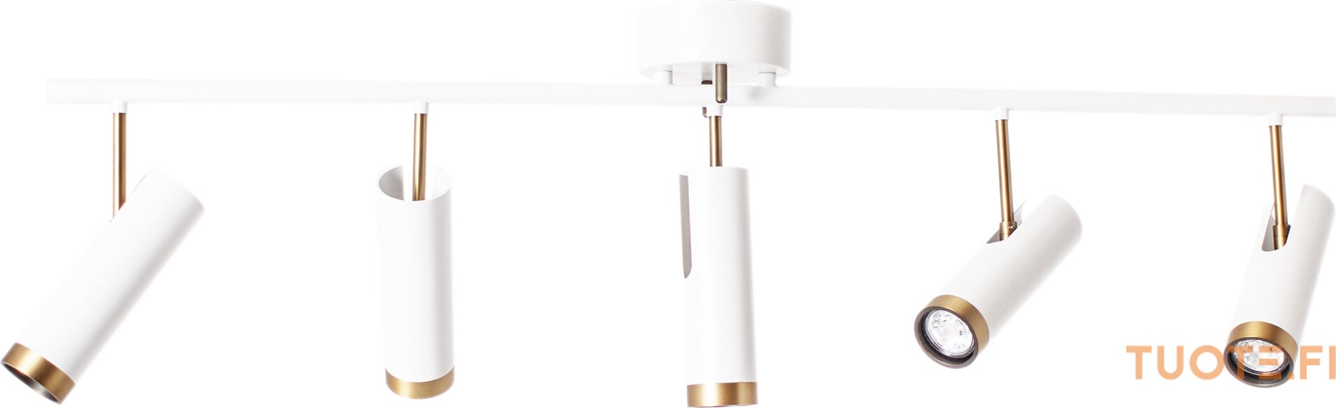 Tyylikäs 5-osainen spottivalaisin reilulla valovoimalla. Jokainen spotti on suunnattavissa, joten valon voi joko levittää koko tilaan tai suunnata korostamaan esimerkiksi tauluja tai lukunurkkausta.