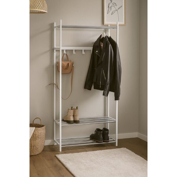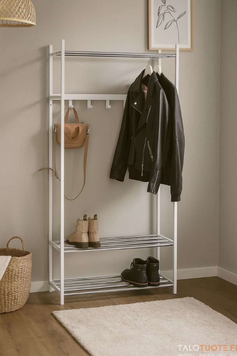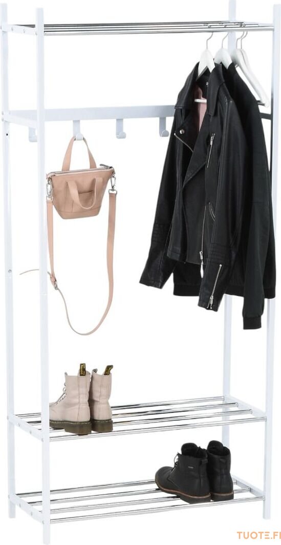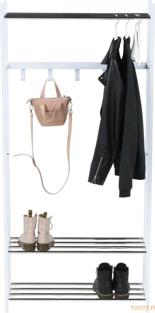 Tyylikkään Lidia-vaatenaulakon valkoinen runko sekä koukut ovat metallia ja ritiläputket kromattua metallia. Vaatenaulakon leveys on 80 cm, syvyys 35 cm ja korkeus 166 cm. Väli lattiasta alatasoon on 7 cm, kahden alimman hyllyn väli 25 cm ja kahden ylimmän hyllyn väli 122 cm. Ritiläputkien leveys on 76 cm. Toimitus osina.
