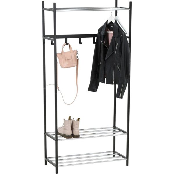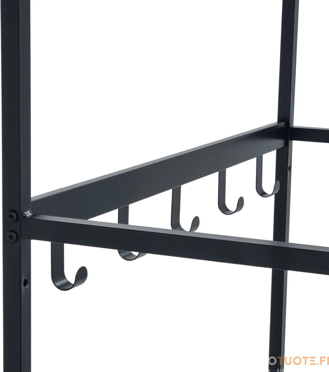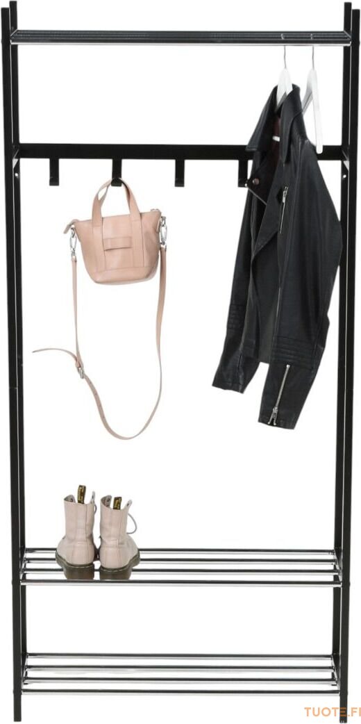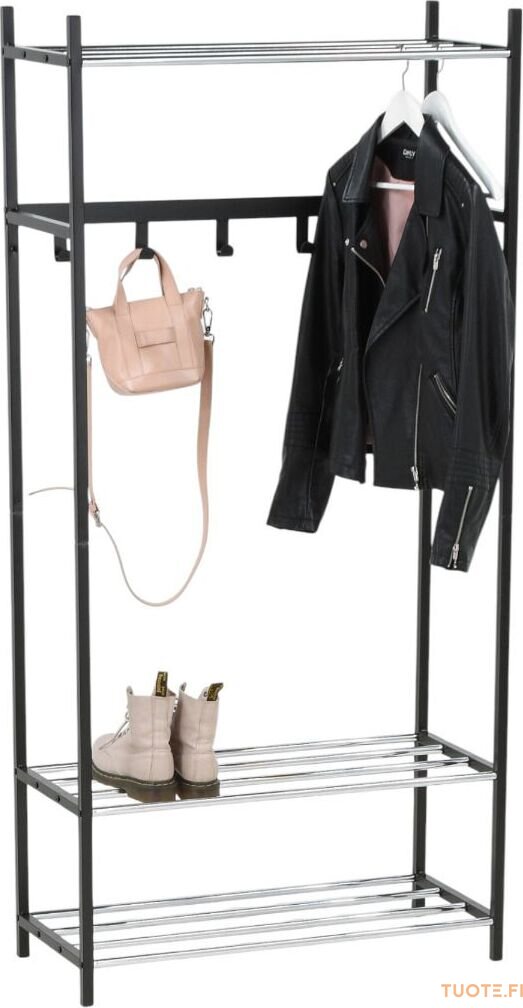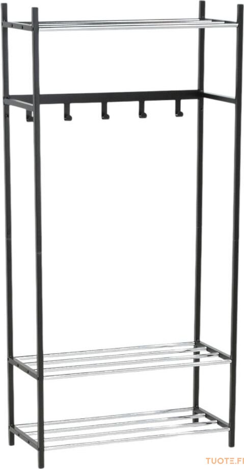 Tyylikkään Lidia-vaatenaulakon musta runko sekä koukut ovat metallia ja ritiläputket kromattua metallia. Vaatenaulakon leveys on 80 cm, syvyys 35 cm ja korkeus 166 cm. Väli lattiasta alatasoon on 7 cm, kahden alimman hyllyn väli 25 cm ja kahden ylimmän hyllyn väli 122 cm. Ritiläputkien leveys on 76 cm. Toimitus osina.