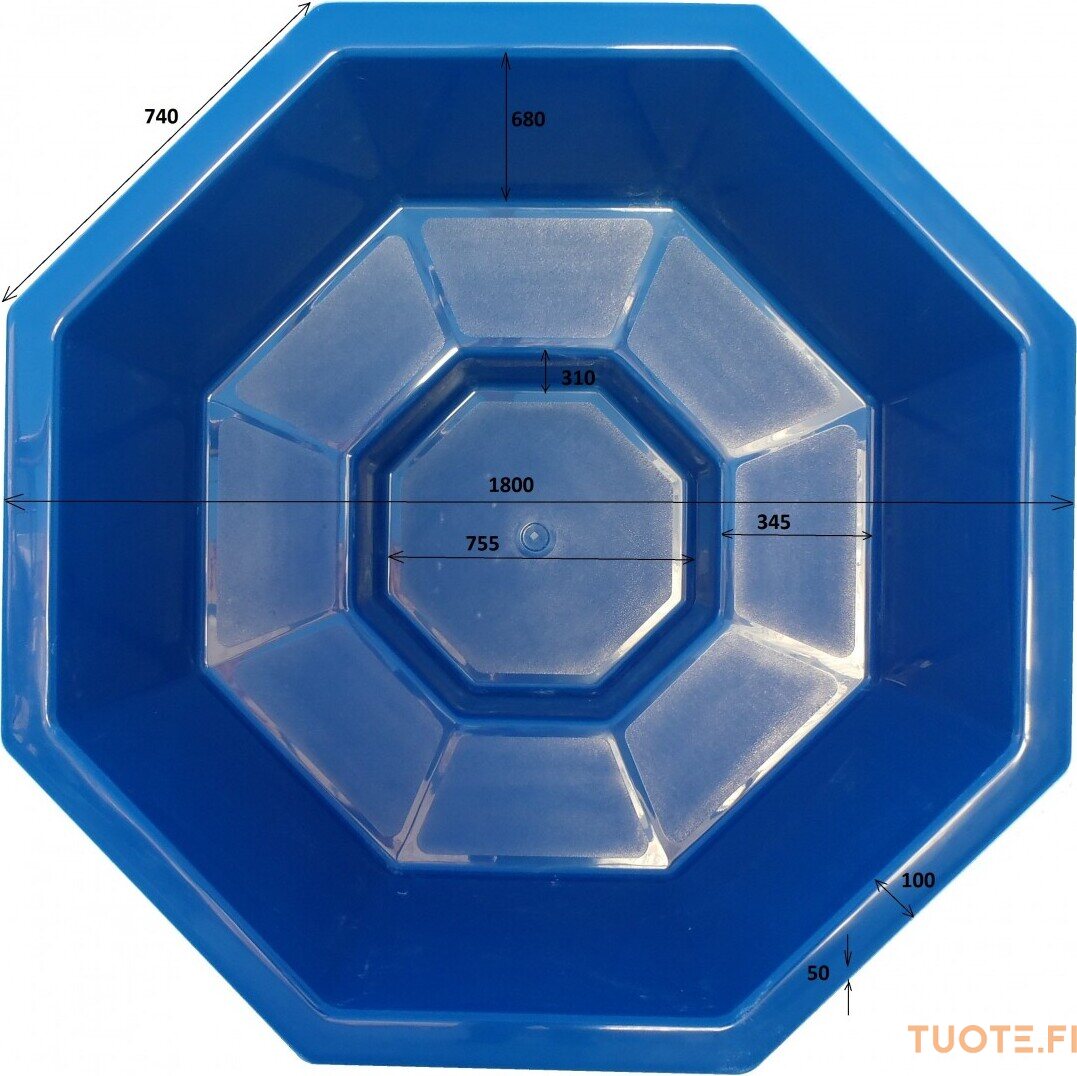 Lasikuitusisustaan mahtuu 1200 L vettä ja se on tarkoitettu 4-5 henkilölle. Sisustasta voi rakentaa itselleen mieluisan kylpytynnyrin.