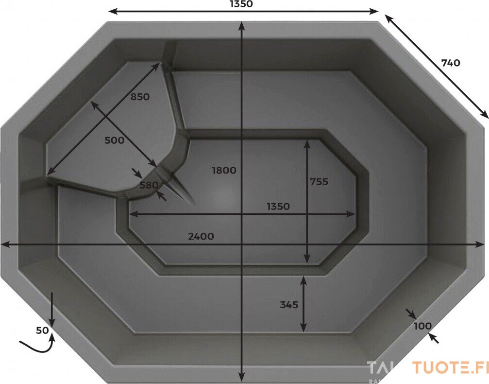 Lasikuitusisustaan mahtuu 1550 L vettä ja se on tarkoitettu 7-8 henkilölle. Sisustasta voi rakentaa itselleen mieluisan kylpytynnyrin. Voi tilata myös kamiinan (valitse sopiva) sekä lisävarusteita (ks. alla).