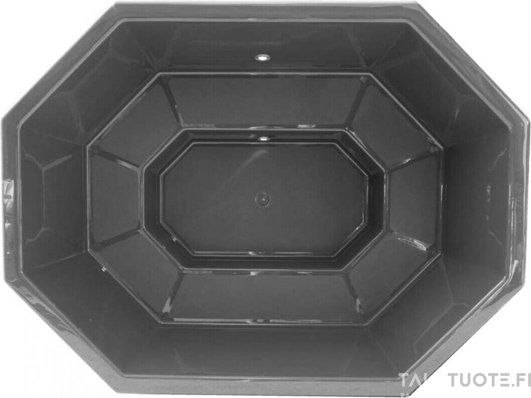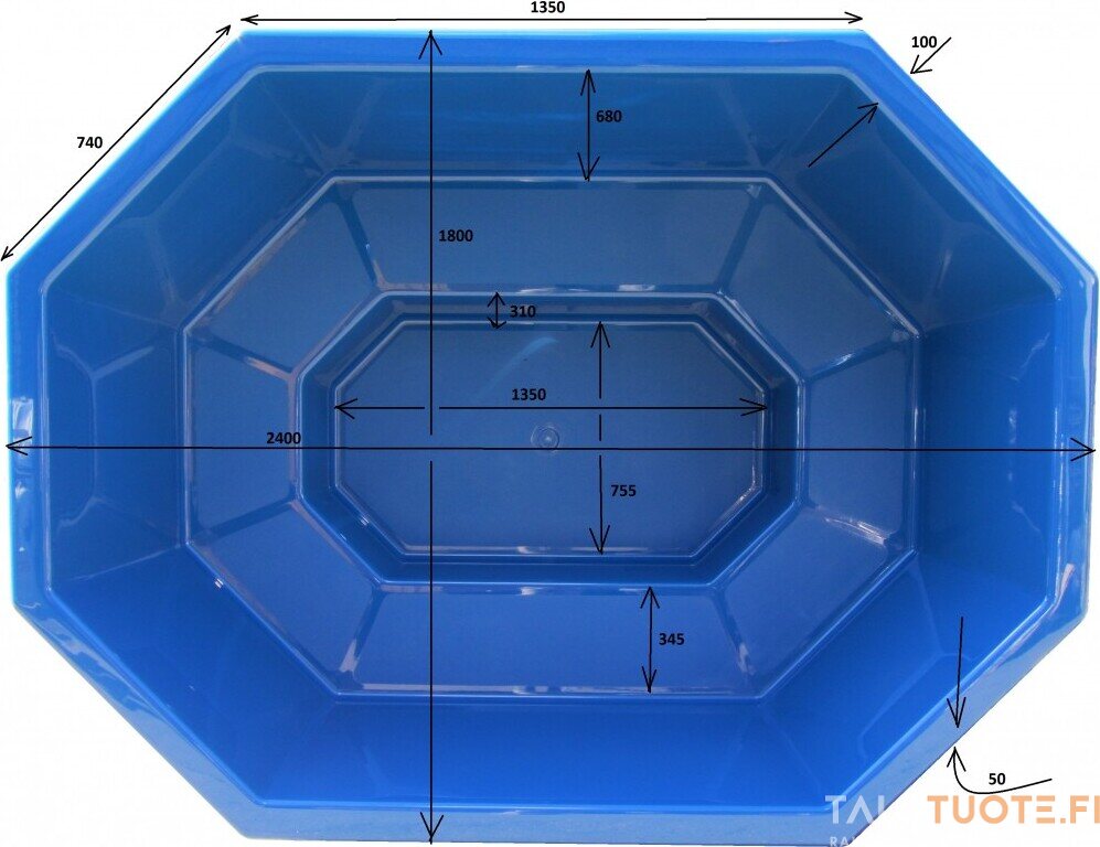 Lasikuitusisustaan mahtuu 1600 L vettä ja se on tarkoitettu 8 henkilölle. Sisustasta voi rakentaa itselleen mieluisan kylpytynnyrin. Voi tilata myös kamiinan (valitse sopiva) sekä lisävarusteita (ks. alla).