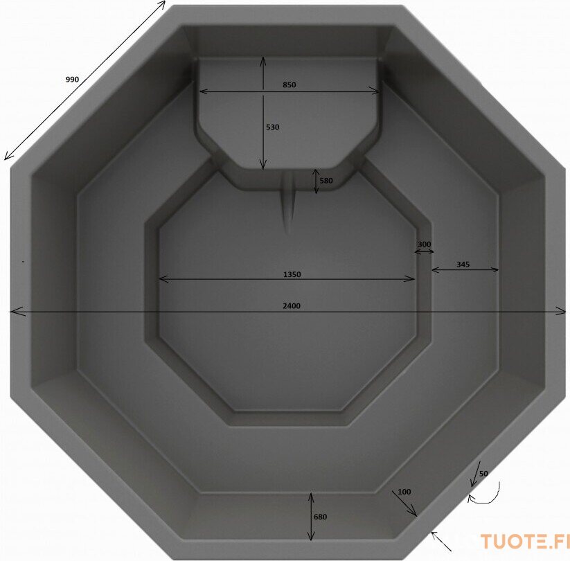 Lasikuitusisustaan mahtuu 2250 L vettä ja se on tarkoitettu 8-10 henkilölle. Sisustasta voi rakentaa itselleen mieluisan kylpytynnyrin. Voi tilata myös kamiinan (valitse sopiva) sekä lisävarusteita (ks. alla).
