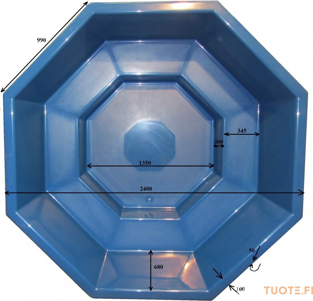 Kylpytynnyriin mahtuu 2300 litraa vettä ja se on tarkoitettu 10 henkilölle. Terassipakettiin sisältyy kaikki tarvittava tynnyrin upottamiseen terassiin. Terassipakettiin sisältyy: lasikuituallas, runko (painekyllästettyä puuta), vedenpoisto, ulkokamiina merialumiinia + tarvikkeet (2 m piippu, letkut, klemmarit, läpiviennit). Terassipakettiin voi tilata myös lisävarusteita (ks. alla).