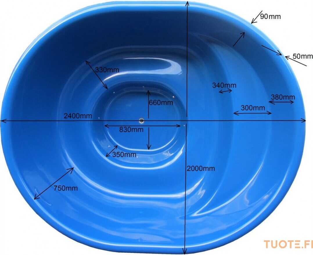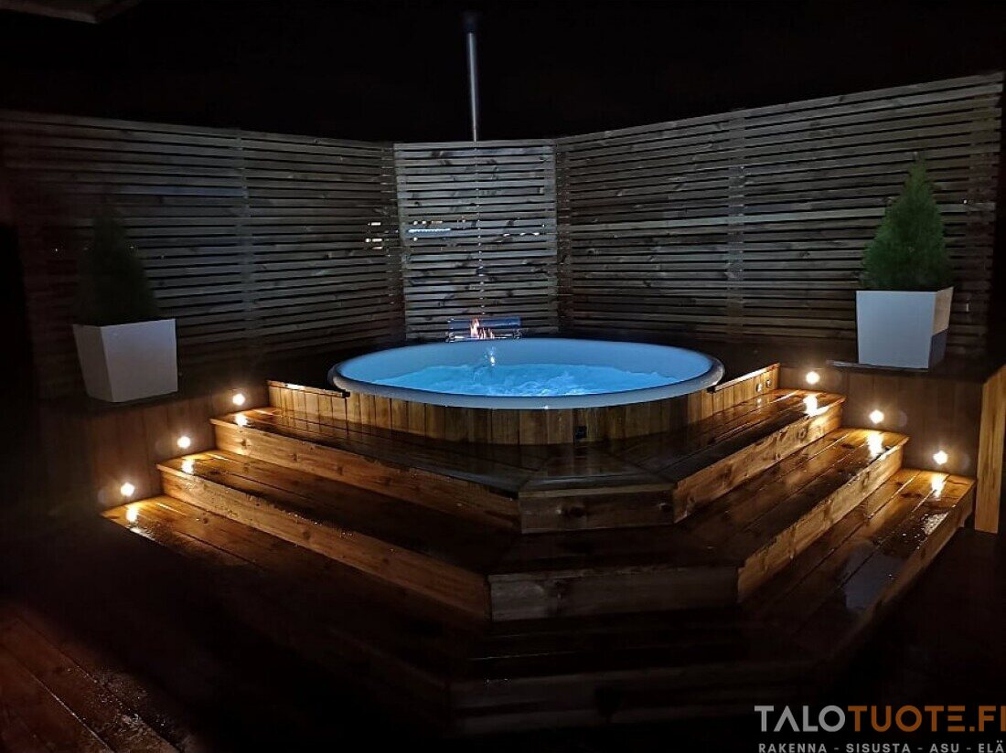 Kylpytynnyriin mahtuu 1700 litraa vettä ja se on tarkoitettu 7-8 henkilölle. Terassipakettiin sisältyy kaikki tarvittava tynnyrin upottamiseen terassiin. Terassipakettiin sisältyy: lasikuituallas, runko (painekyllästettyä puuta), vedenpoisto, ulkokamiina merialumiinia + tarvikkeet (2 m piippu, letkut, klemmarit, läpiviennit). Terassipakettiin voi tilata myös lisävarusteita (ks. alla).