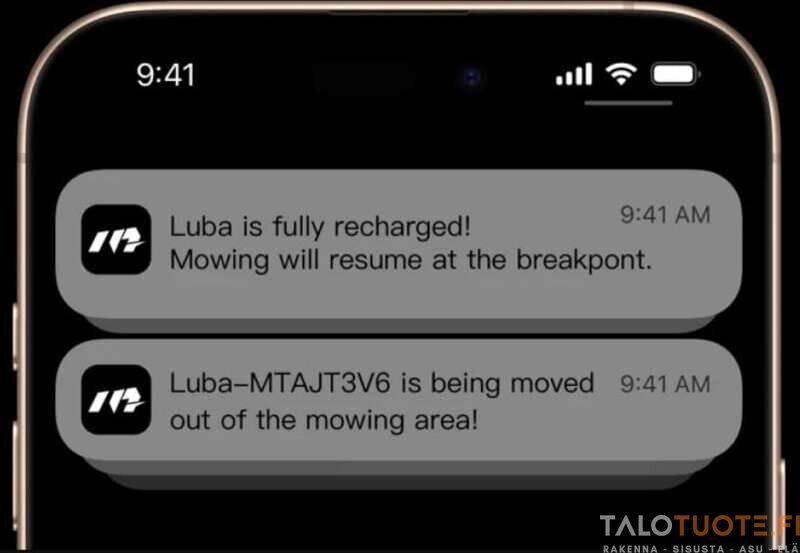 Automaattilataus ja älykäs varkaudenesto – Luba lataa itsensä automaattisesti, joten se on aina valmis seuraavaan työtehtävään. Varkaudenesto tuo lisäturvaa ja suojaa robottia mahdollisilta varkauksilta.