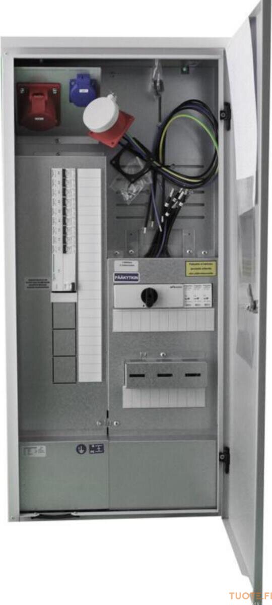 Mittauskeskus IP34. Varavoiman kojevastake 32A. Johdonsuojakatkaisijat 3 kpl C10A 7 kpl C16A. Vikavirtasuoja 40A. Ylijännitesuoja T2 40kA. Varatilaa 10 moduulia. Läpivientilaippa syöttö VET 26-35. Asunnon nousukaapeleita varten HTC-17 laippa. Lisävarusteena saatavilla jalusta.