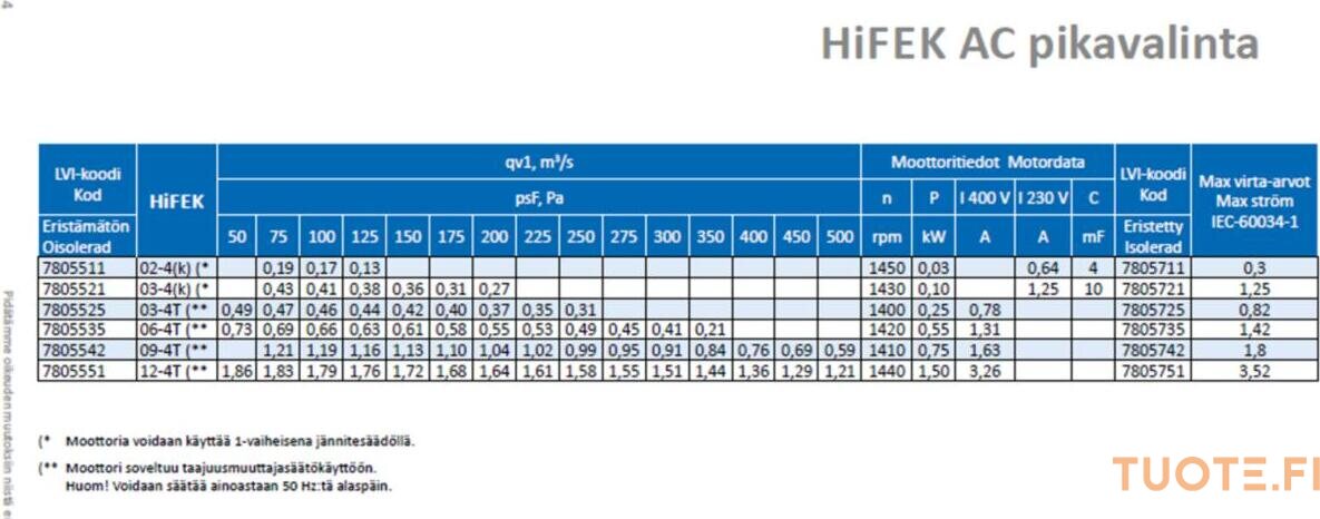 Huippuimurien teho vaihtelee 0.25 kW ja 1.5 kW välillä.