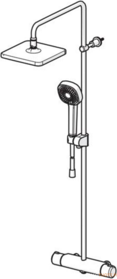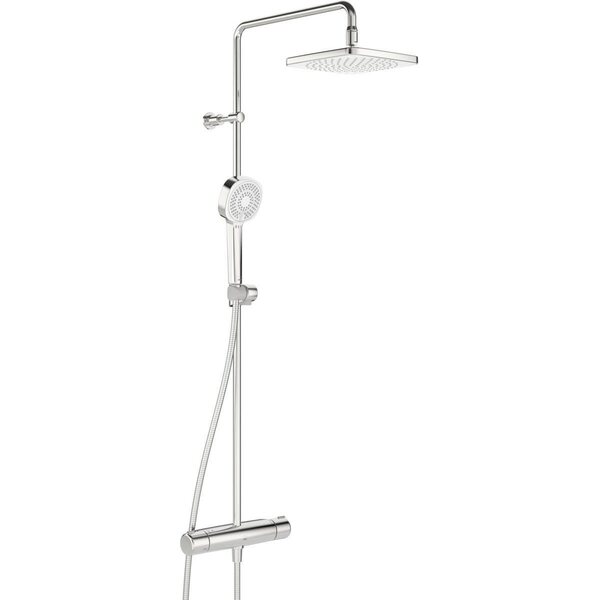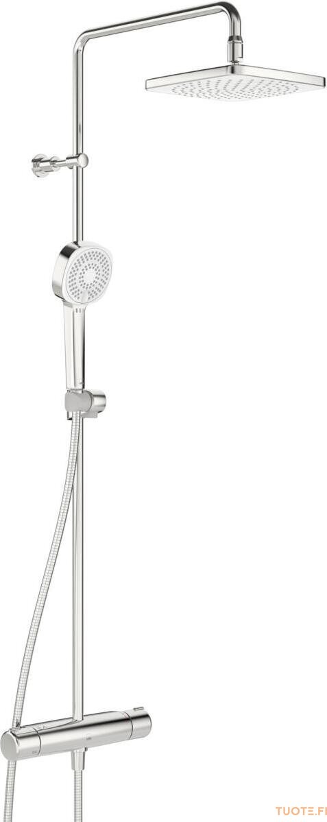 Termostaattinen sadesuihkuhana, jossa on pyöreänkulmikas, 200 x 200 mm kattosuihku, 3-toiminen Oras Apollo Style -käsisuihku (ø 95 mm), käsisuihkun pidike, suihkuletku ja suihkutanko. Lämmönsäätökahvassa on lämpötilanrajoitin, joka voidaan ohittaa nappia painamalla. Ecoflow-virtaamasäädin. Hanassa on roskasihdit ja yksisuuntaventtiilit.