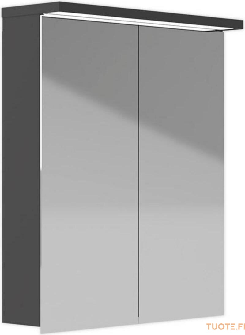 Uusi tyylikäs valaisinpeilikaappimalli. Kaksipuoleiset peiliovet hidastetuilla saranoilla, joiden säätö useampaan suuntaan on helppoa. Peilin alareuna ulottuu kaapin alapuolelle, joten erillisiä vetimiä ei tarvita oven avaukseen. Kokonaisuuden kruunaa LED-moduulilla varustettu valolippa. Kaapin sisällä kaksi siirrettävää hyllyä koko kaapin leveydeltä. Kaksiosainen pistorasia kaapin sisällä oikealla tai vasemmalla puolella. Kolme eri leveysvaihtoehtoa. Materiaali erinomaisesti roiskevettä kestävää nanokeraamisesti suojattua jauhemaalattua terästä.