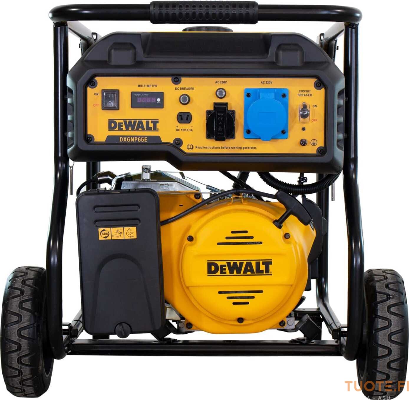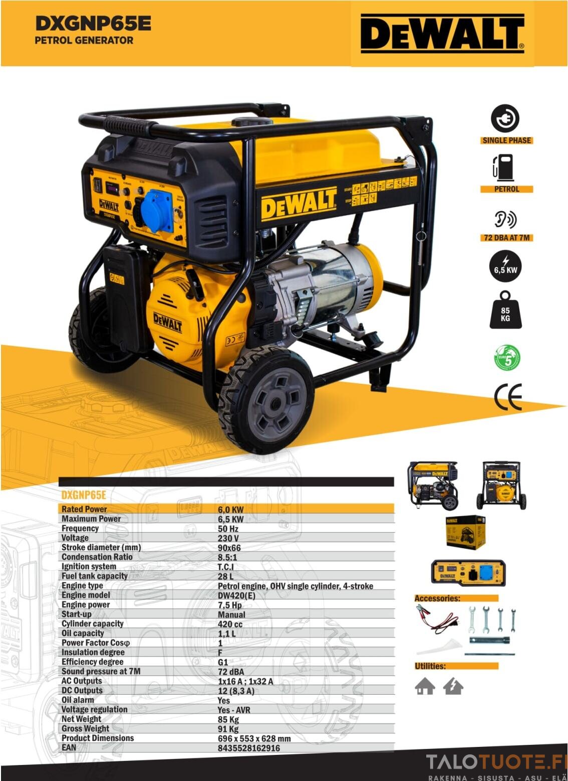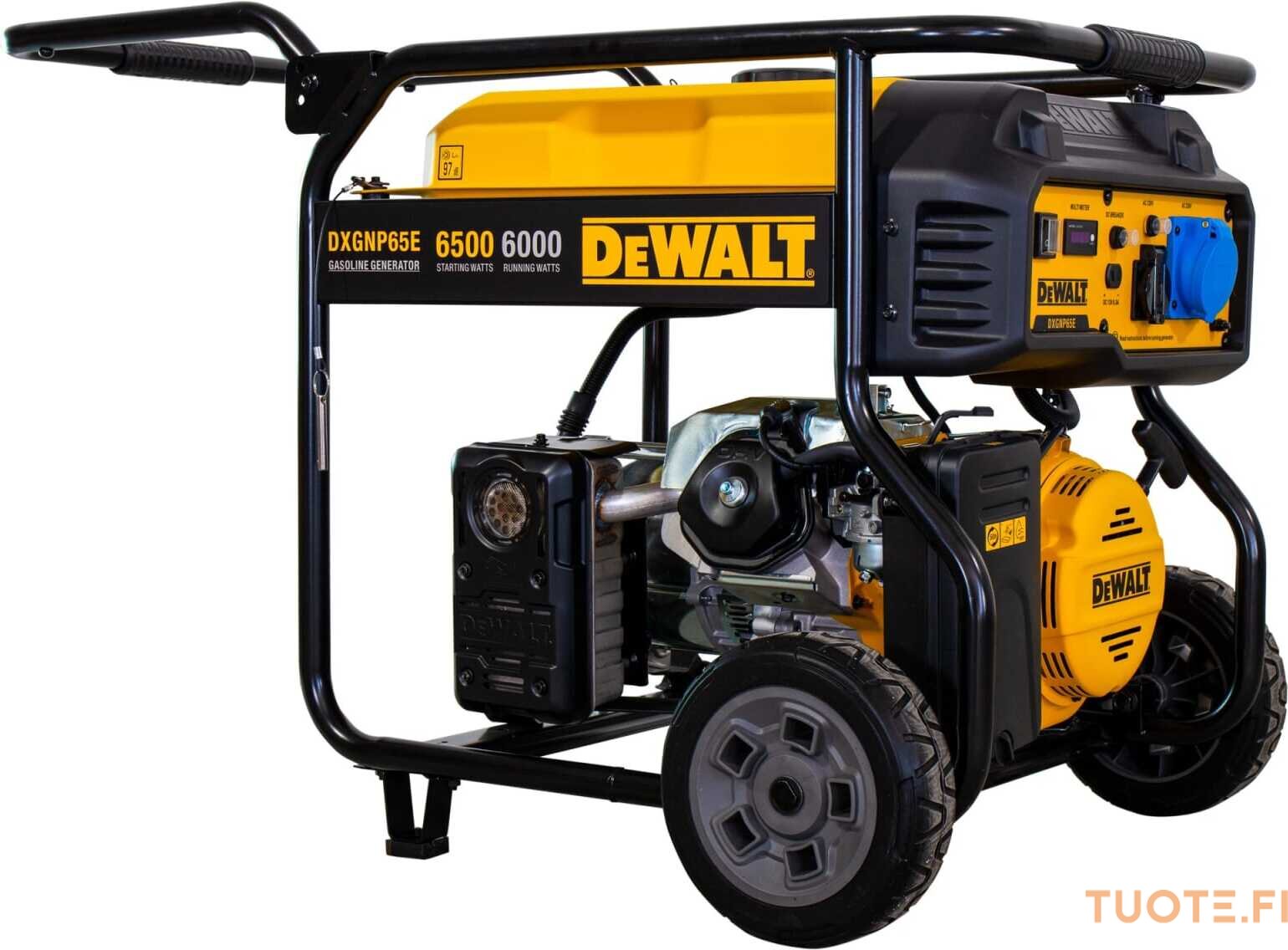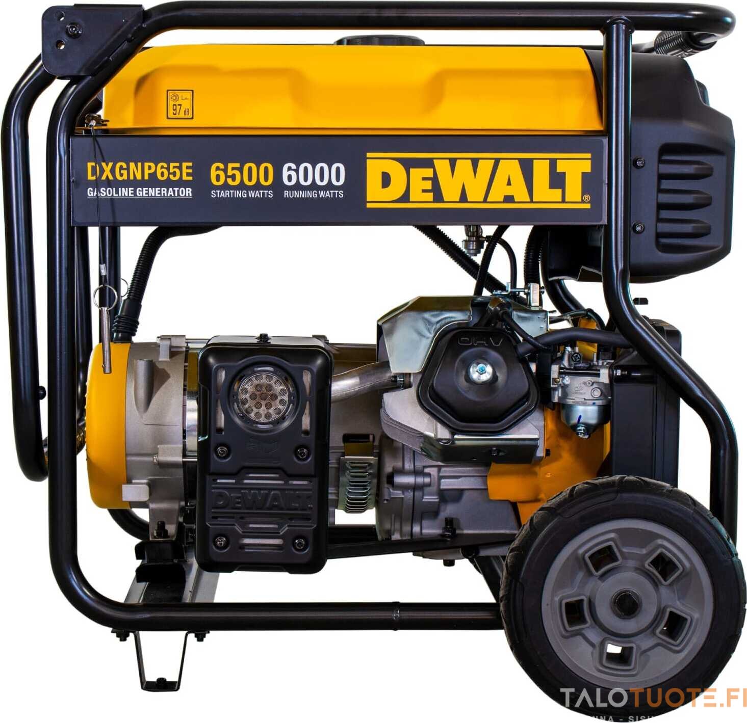 DeWalt DXGNP65E on bensiinitoiminen, raskaan sarjan aggregaatti joka on renkaiden ansiosta parhaimmillaan liikkuvassa työssä. DXGNP65E:n maksimiteho on 6500W ja se voi toimia jopa kuormituksen alaisena jopa 11 tuntia yhtäjaksoisesti. 28 litran polttoainesäiliö takaa häiriöttömän käytön pitkäksi aikaa.
